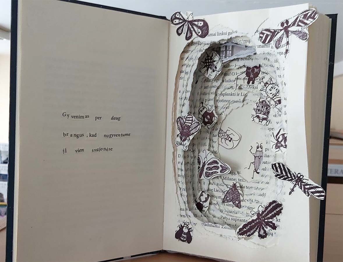 Idėja suteikti knygai naują paskirtį kilo pasitarus su technologijų mokytoja Laima Kantakevičiene ir radus įdomios informacijos internete. Mane sudomino menininkė Nicola Nobo, kuri senas knygas paverčia tikrais meno kūriniais. Merginos rankomis lankstomi knygų puslapiai pamažu virsta origamio šedevru, kuriuos menininkė vadina „book okigami“ (liet. knygų origamis).